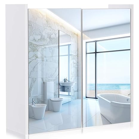Tangkula Mirrored Bathroom Cabinet Wall Mount Storage Organizer Medicine Cabinet With Double Doors White 25 Wood Shelf